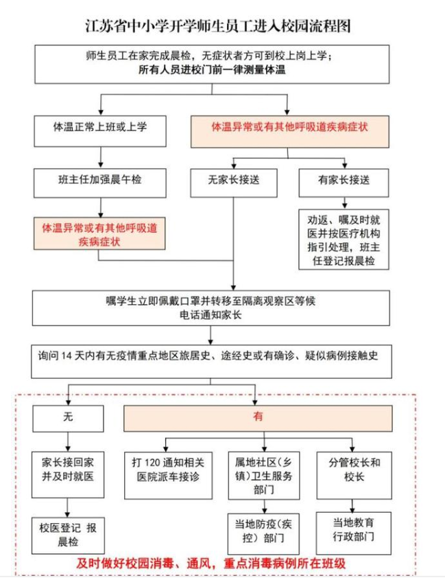 江蘇省規(guī)定開(kāi)學(xué)時(shí)間,并作出教職工和學(xué)生進(jìn)入校園流程圖,新聞指出現(xiàn)在疫情減緩,但是任何的工作單位都不能掉以輕心,學(xué)校更是如此,學(xué)生全天在教室里,空氣經(jīng)常不流通,住宿生健康更是需要老師關(guān)注的,不要害怕出現(xiàn)問(wèn)題,出現(xiàn)問(wèn)題及時(shí)隔離班級(jí)學(xué)生并上報(bào)給相關(guān)部門(mén)。