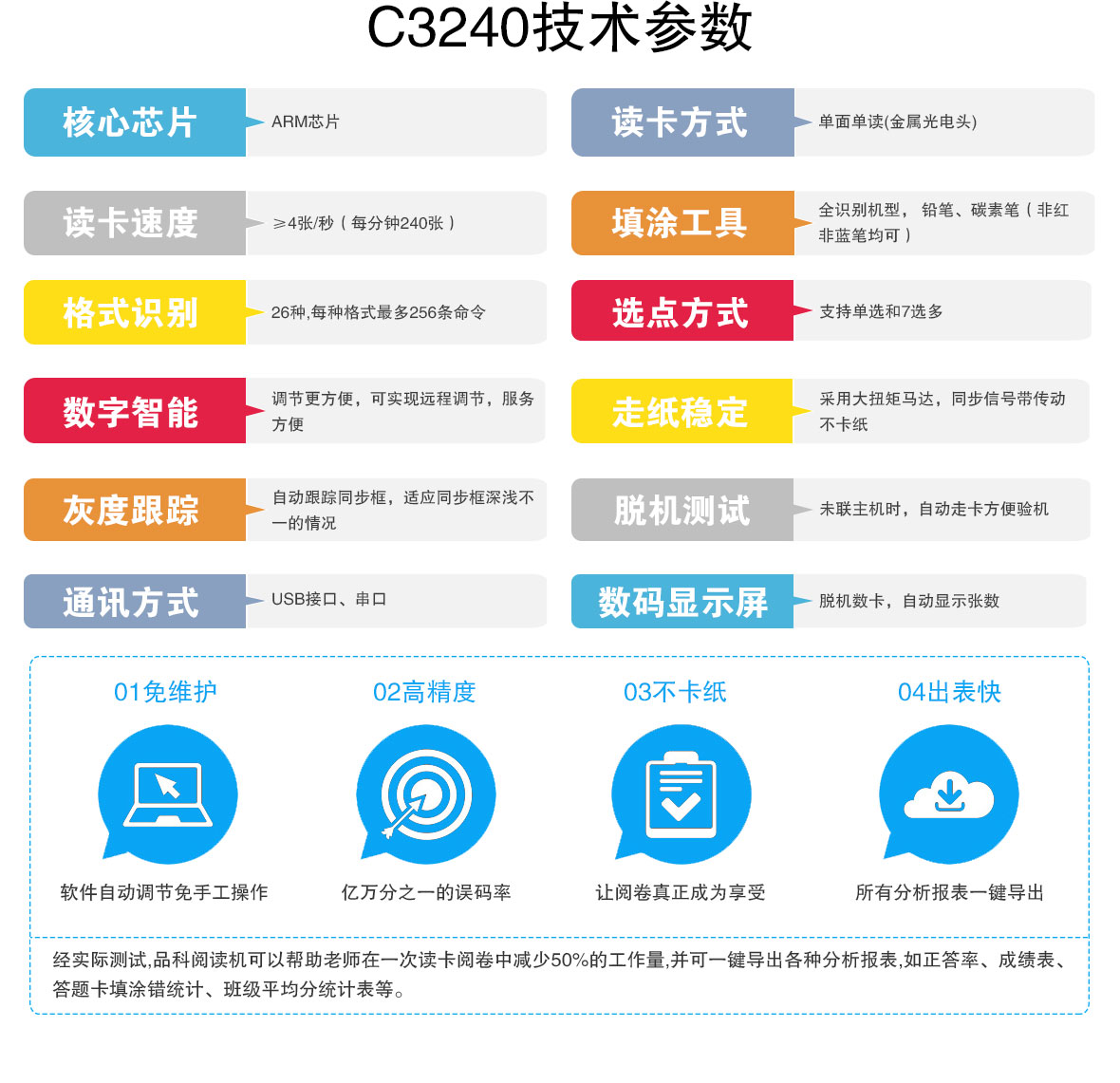品科C3240閱卷機支持成績自動推送和云端分析,掃描速度可達到4張/秒。使用8代芯片,USB免驅安裝