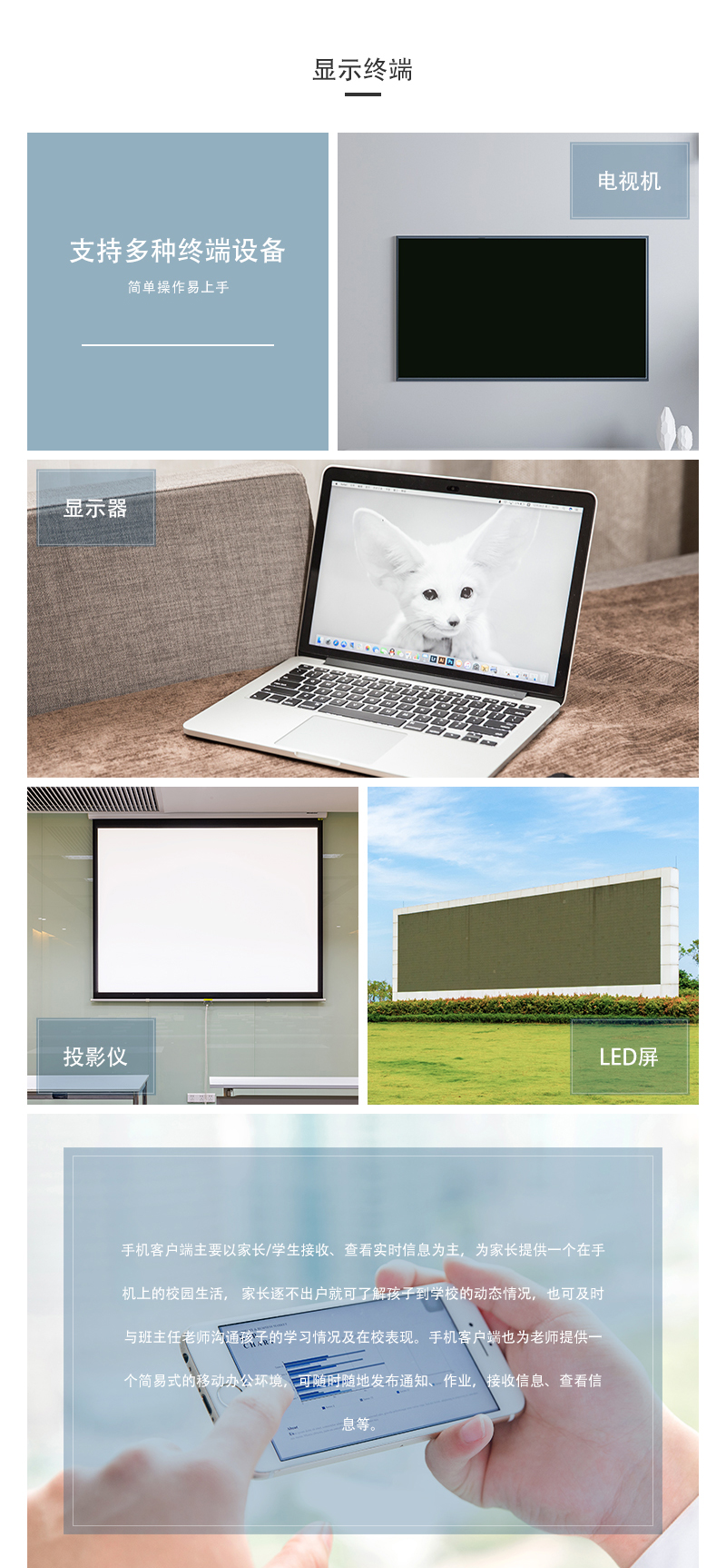 支持電視機(jī)、顯示器、投影儀、LED屏、手機(jī)端等多種顯示終端,簡單操作易上手。手機(jī)客戶端主要以家長/學(xué)生接收、查看實(shí)時信息為主,家長逐不出戶就可了解孩子到學(xué)校的動態(tài)情況,也可及時與班主任老師溝通孩子的學(xué)習(xí)情況及在校表現(xiàn)。手機(jī)客戶端也為老師提供一個簡易式的移動辦公環(huán)境,可隨時隨地發(fā)布通知、作業(yè),接收信息、查看信息等。