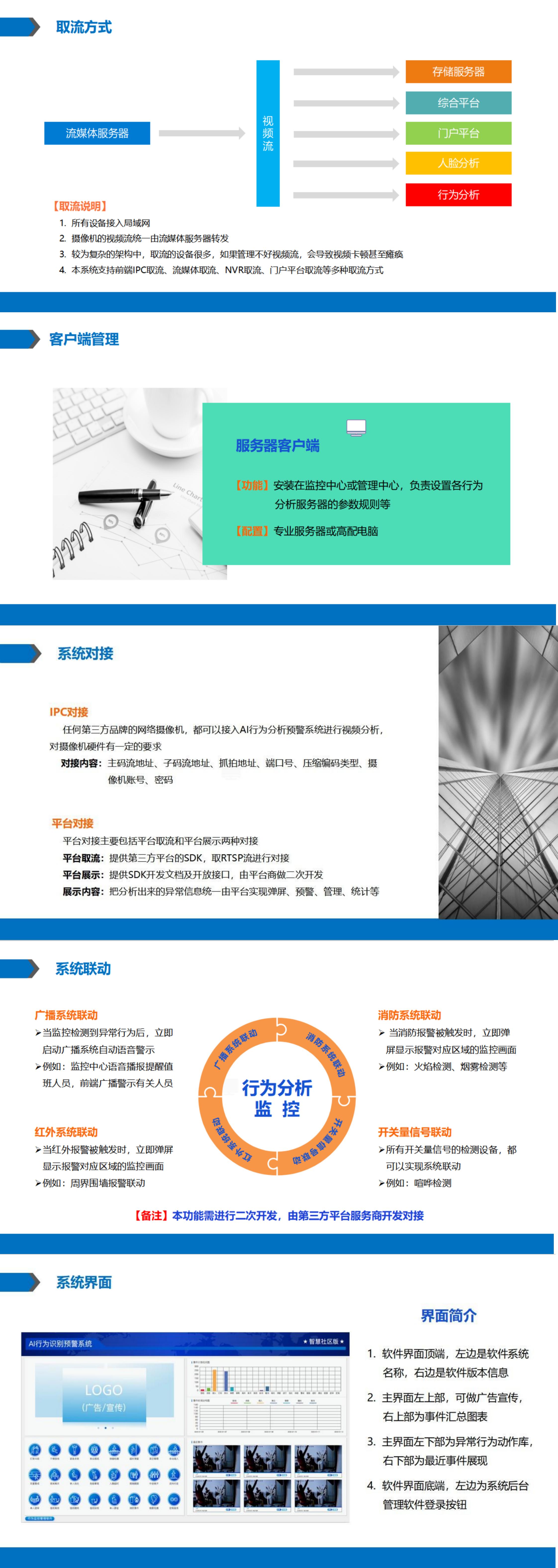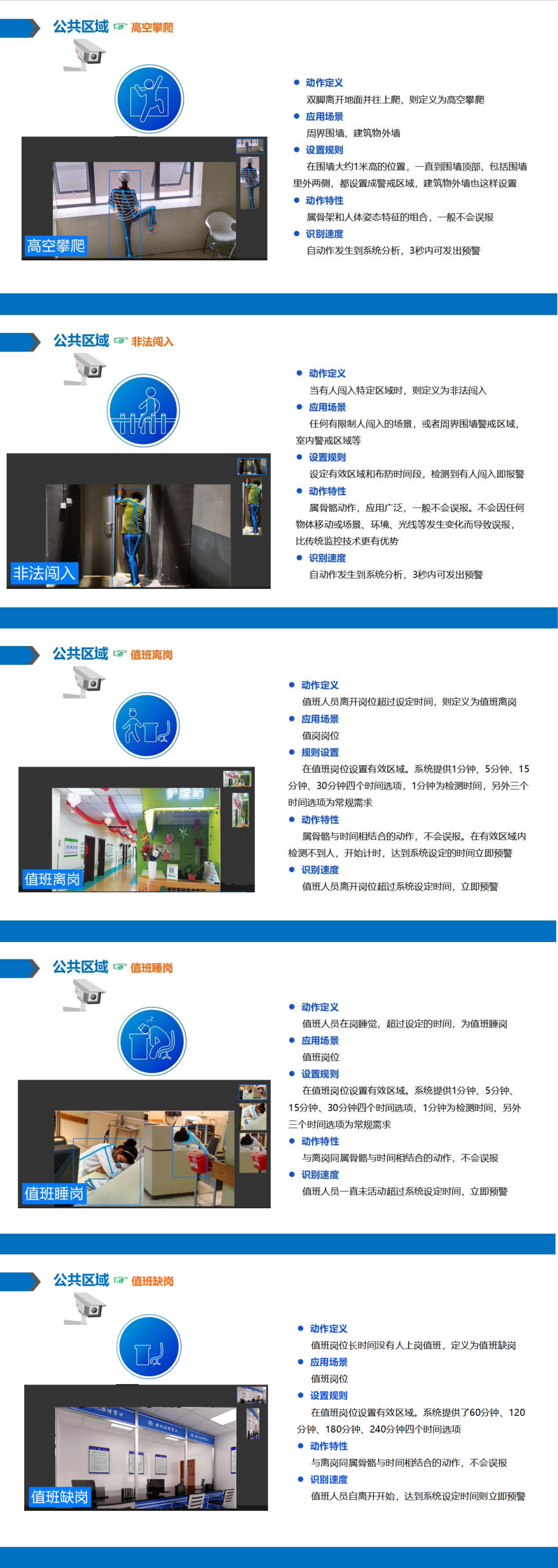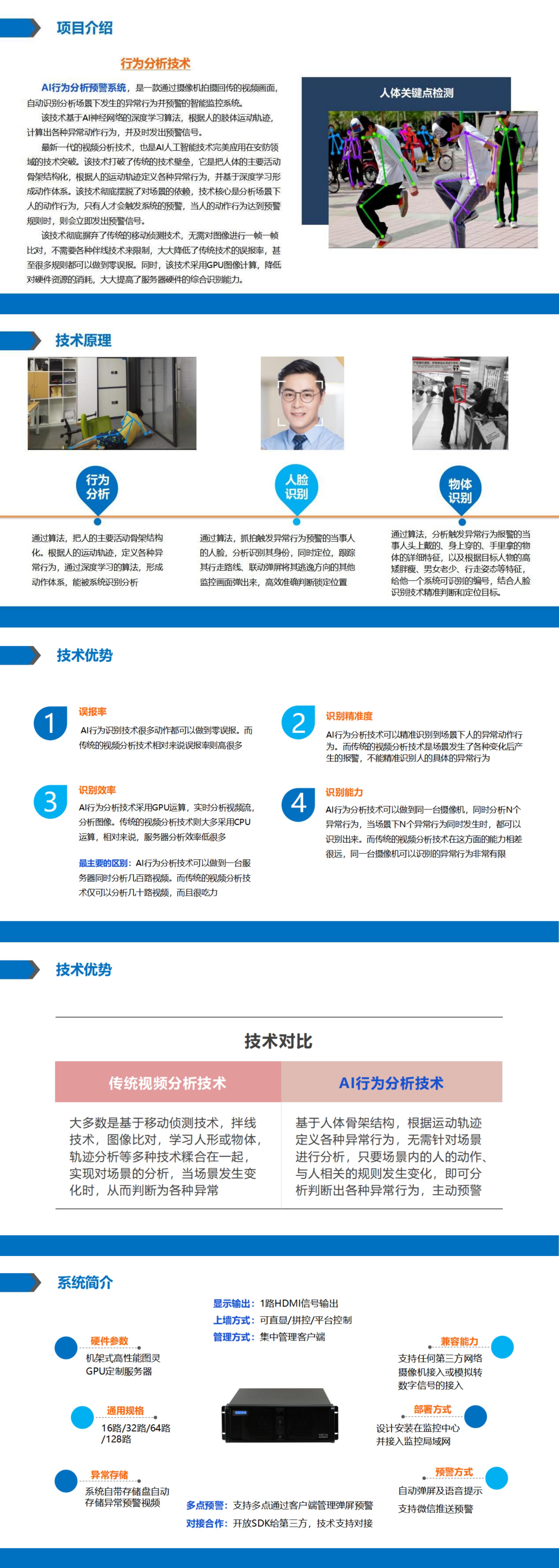 AI行為分析預警系統:人工智能技術解析視頻中的異常行為(傳統監控+AI=智慧監控),是一款能通過監控攝像機拍攝回來的視頻畫面去自動識別分析場景下發生的異常行為并預警的智慧監控預警系統。提升風險預警,事前干預,應急事件處理聯動。